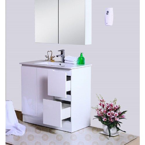 Premium quality bathroom vanity Solid drawers and solid drawers base 3 section soft close drawer runners Ceramic Top with 1 Tap Hole Full MDF moisture resistant board With kick board Aluminium rust resistant bar handle FAUCET POP UP&DRAINAGE NOT Included