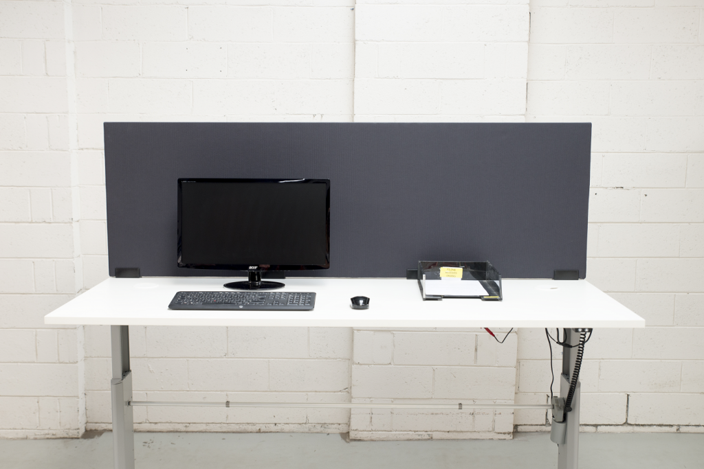 These partitions are 600mm x 1800mm and is upholstered in charcoal fabric. They come with desk clamps and the surface is suitable for pinning notes and charts etc to be able to assist in presentations or to display.