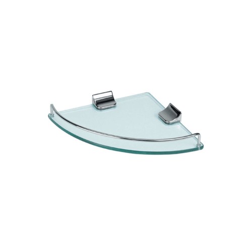 This glass shelf can be fixed to the wall within a wet environment. The shelf is glass and the ends are made of brass and finished in chrome to increase the life span and reduce rusting.