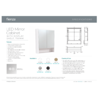 LED light channel along top of cabinet Cool white colour temperature (4000K) Built-in demister Illuminating touch sensors for light and demister Double-sided glass mirror doors 3mm thick, pencil edge copper-free glass mirrors Open display shelf Soft-close doors Two adjustable internal glass shelves Includes wall mounting screws and anchor plugs 220-240V AC 50/60Hz with plug – no electrician installation required IP20 rating SAA approved Width: 750mm x Height: 850mm x Depth: 180mm