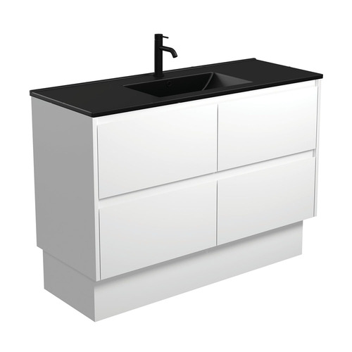 2pac satin white exterior (70% matte, 30% gloss) Bright white interior Bevelled edge pull channel Full extension, soft close drawer runners 16 mm thick backing boards & drawer bases Made from sustainably sourced timber Part of Fienza’s universal vanities range Width: 1200mm x Depth: 465mm x Height: 870mm