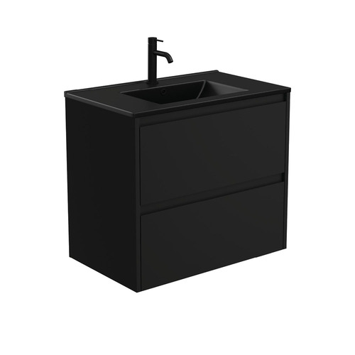 2pac satin black exterior (70% matte, 30% gloss) Bright white interior Bevelled edge pull channel Full extension, soft close drawer runners 16 mm thick backing boards & drawer bases Made from sustainably sourced timber Part of Fienza’s universal vanities range Width: 750mm x Depth: 465mm x Height: 670mm