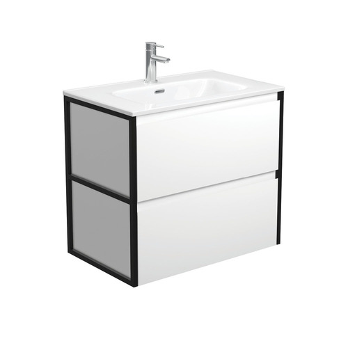 2pac satin white exterior (70% matte, 30% gloss) Powdercoated matte black frame panels (one for each side) Bevelled edge pull channel Full extension, soft close drawer runners 16 mm thick backing boards & drawer bases Made from sustainably sourced timber Part of Fienza’s universal vanities range Width: 750mm x Depth: 465mm x Height: 670mm