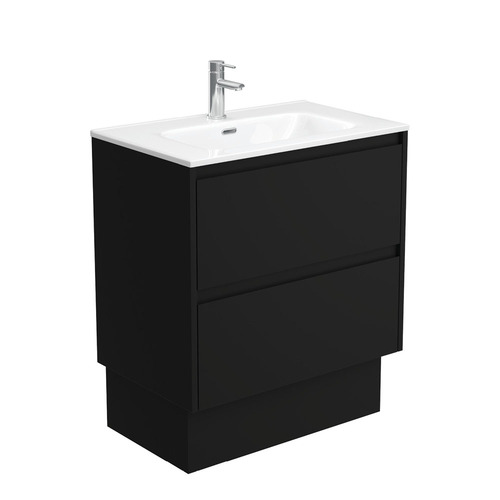 2pac satin black exterior (70% matte, 30% gloss) Bright white interior Bevelled edge pull channel Full extension, soft close drawer runners 16 mm thick backing boards & drawer bases Made from sustainably sourced timber Part of Fienza’s universal vanities range Width: 750mm x Depth: 465mm x Height: 870mm
