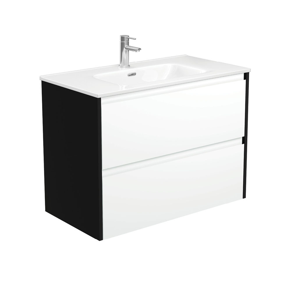 2pac satin white exterior (70% matte, 30% gloss) 2pac satin black finish on side panels (70% matte, 30% gloss) Bright white interior Bevelled edge pull channel Full extension, soft close drawer runners 16 mm thick backing boards & drawer bases Made from sustainably sourced timber Part of Fienza’s universal vanities range Width: 900mm x Depth: 465mm x Height: 670mm