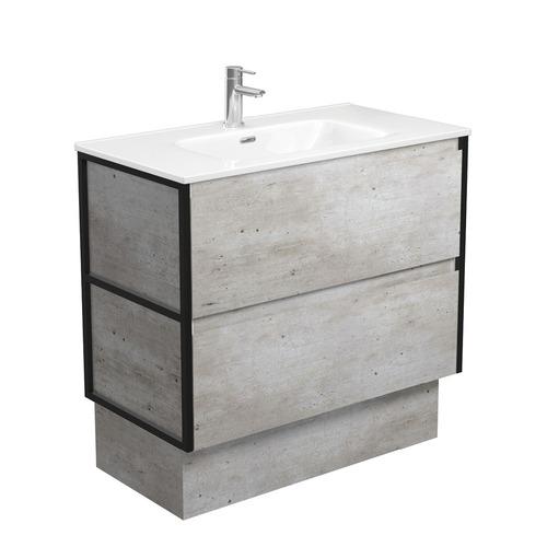 Textured industrial finish on exterior & interior Powdercoated matte black frame panels (one for each side) Bevelled edge pull channel Full extension, soft close drawer runners 16 mm thick backing boards & drawer bases Made from sustainably sourced timber Part of Fienza’s universal vanities range Width: 900mm x Depth: 465mm x Height: 870mm