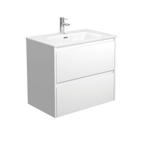2pac satin white exterior (70% matte, 30% gloss) Bright white interior Bevelled edge pull channel Full extension, soft close drawer runners 16 mm thick backing boards & drawer bases Made from sustainably sourced timber Part of Fienza’s universal vanities range Width: 750mm x Depth: 465mm x Height: 670mm