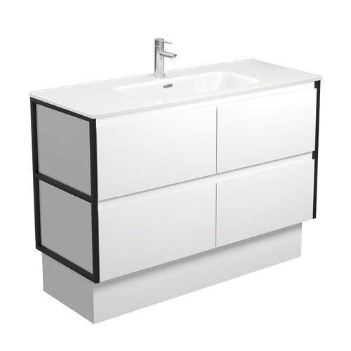 2pac satin white exterior (70% matte, 30% gloss) Powdercoated matte black frame panels (one for each side) Bevelled edge pull channel Full extension, soft close drawer runners 16 mm thick backing boards & drawer bases Made from sustainably sourced timber Part of Fienza’s universal vanities range Width: 1200mm x Depth: 465mm x Height: 870mm