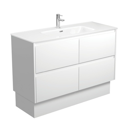 2pac satin white exterior (70% matte, 30% gloss) Bright white interior Bevelled edge pull channel Full extension, soft close drawer runners 16 mm thick backing boards & drawer bases Made from sustainably sourced timber Part of Fienza’s universal vanities range Width: 1200mm x Depth: 465mm x Height: 870mm