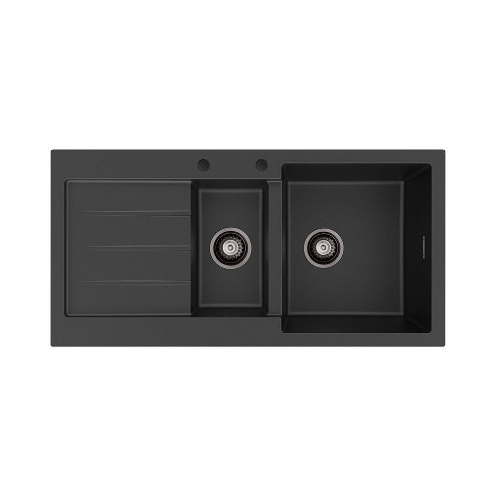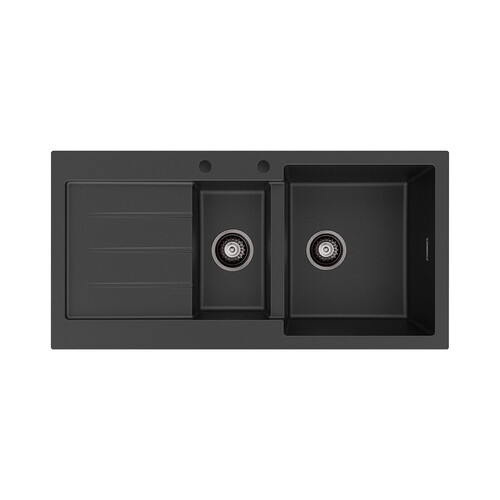Fienza Kuro Granite 32L/14L Double Kitchen Sink Bowl with Drainer Right Bowl 2TH Matte Black 68610R-2