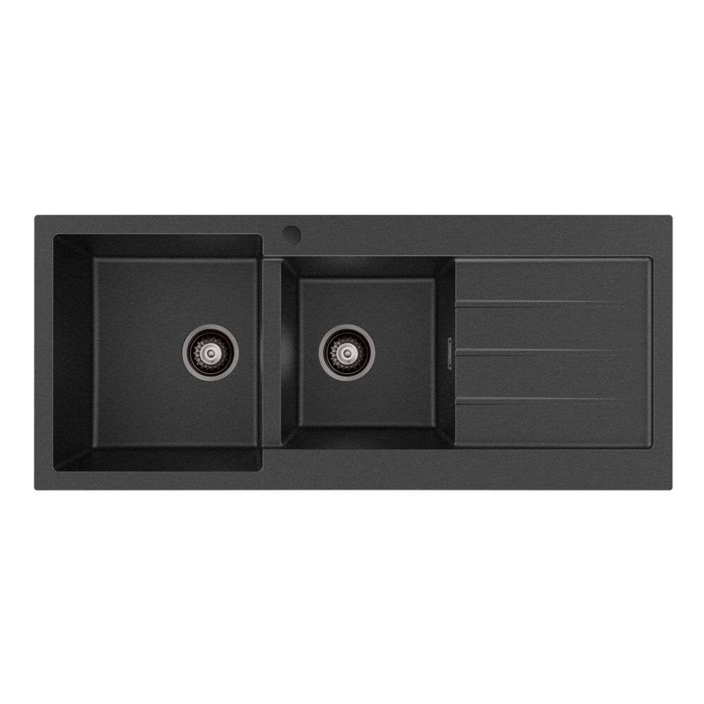 Fienza Kuro Granite 32L/22L Double Kitchen Sink Bowl with Drainer Left Bowl 1TH Matte Black 68606L-1