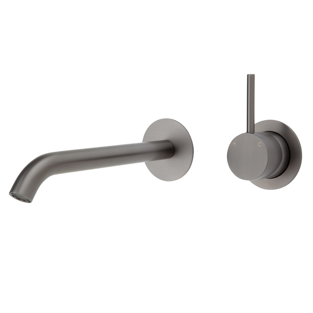 Fienza Up Wall Basin Bath Mixer Set Gun Metal Round Plates 200mm Outlet Kaya 228118GM-200-LF