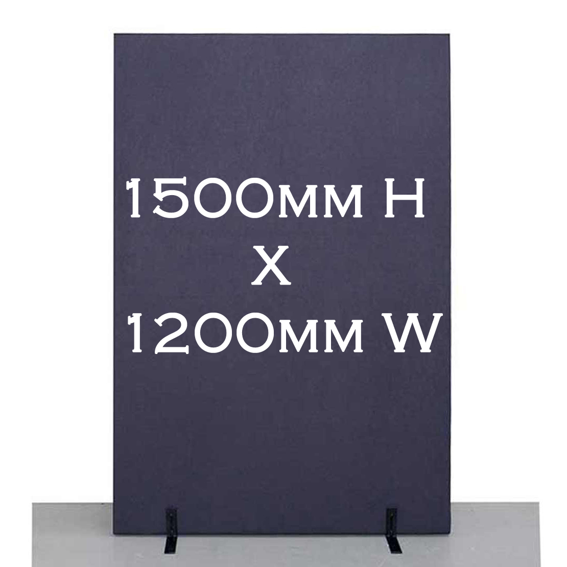 These partitions are 1500mm x 1200mm and are upholstered in charcoal. We can order other colours in but stock the charcoal. They come with two feet so that they can be free standing.