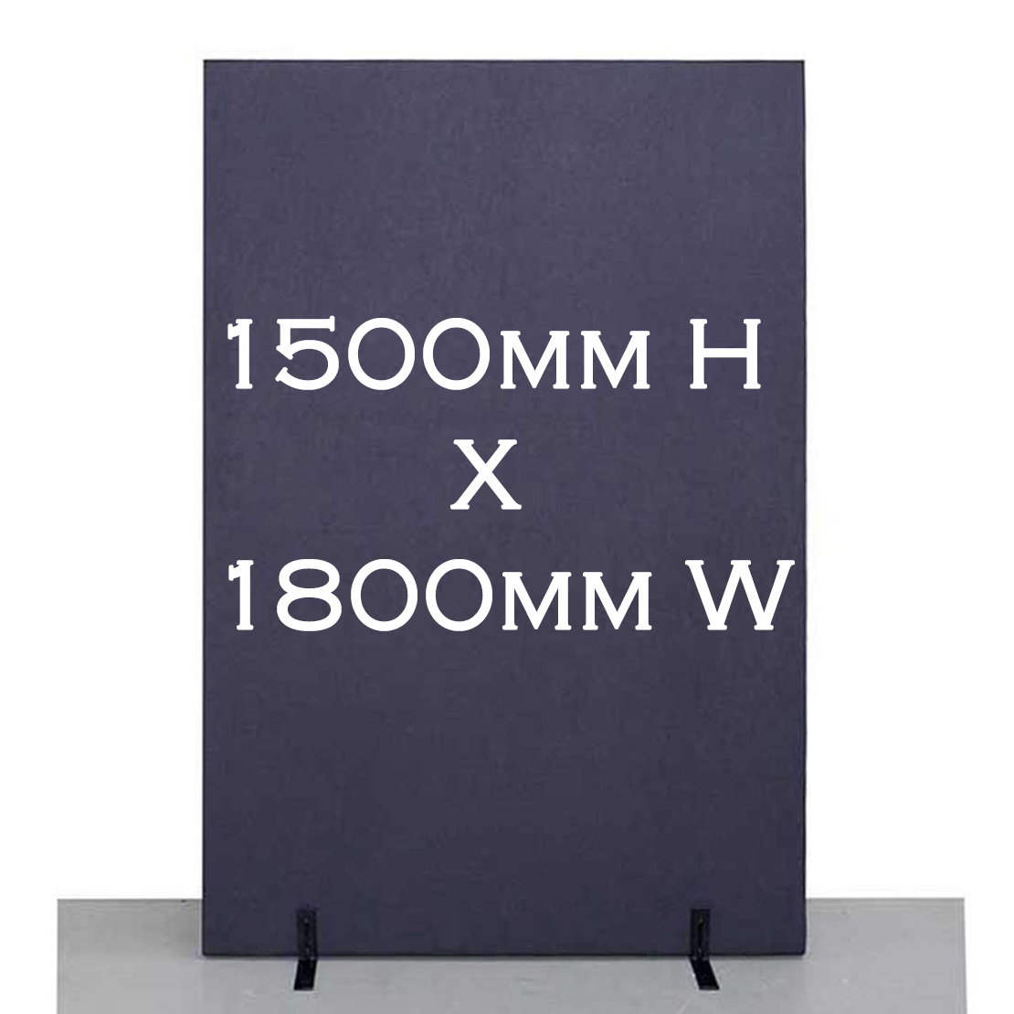 These partitions are 1500mm x 1800mm and are upholstered in charcoal. We can order other colours in but stock the charcoal. They come with two feet so that they can be free standing.