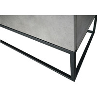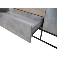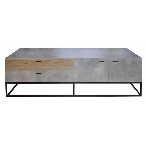 The Jay entertainment unit features a black metal powder coat base and a cement MDF finish. A top oak finish contrasting drawer breaks up the industrial styling.