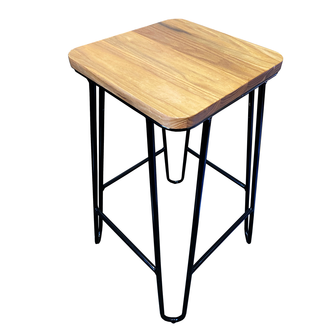 Black metal hairpin tube base with a square reclaimed timber top. A simple yet solid design. Suitable for commercial use. Loop Counter Stool