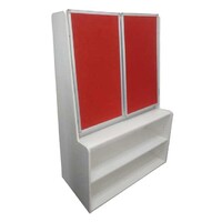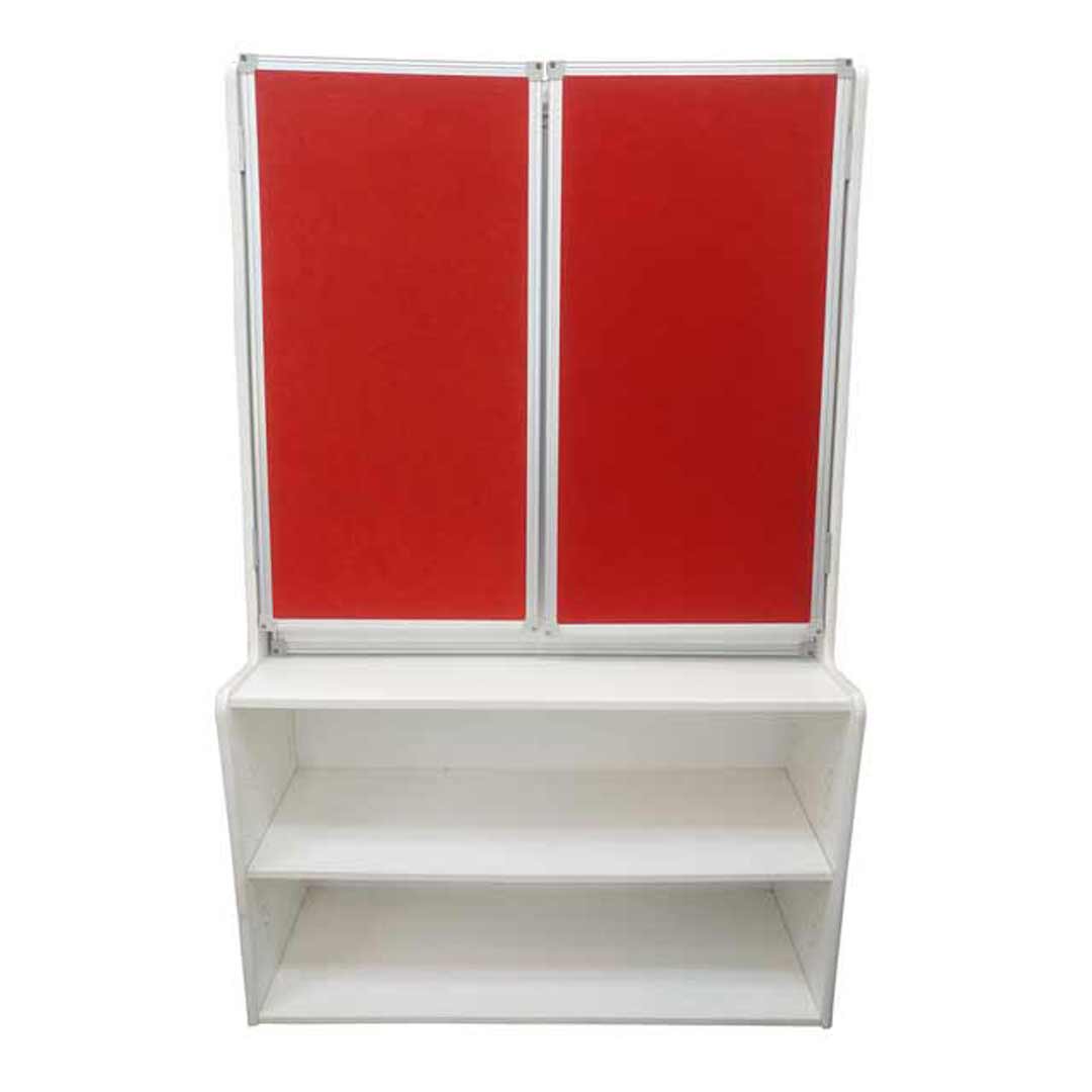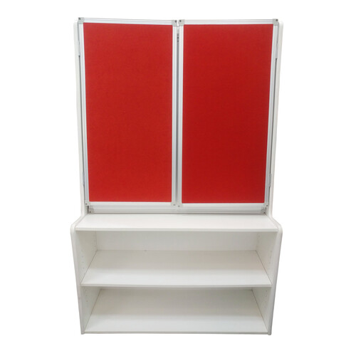 Features 2 pinboard doors - available to order in a range of colours, 900 x 900 centre magnetic whiteboard, adjustable shelving, paper pad holder and heavy-duty locking caster wheels.