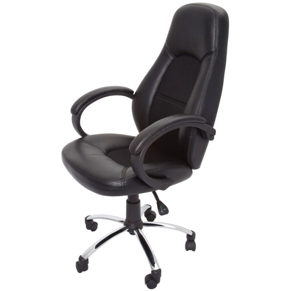 Executive high back chair with a different design. Fabric inlay for extra comfort, chrome base and upholstered arms. Comes with an infinite tilt lock allowing the user to set multiple recline positions.