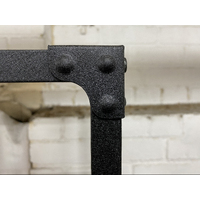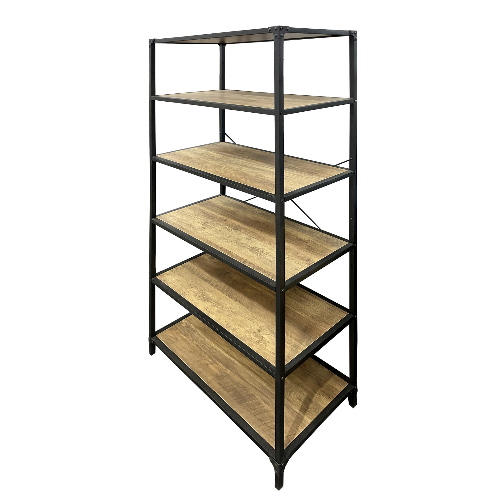 Rustic timber laminate with black steel frame.
