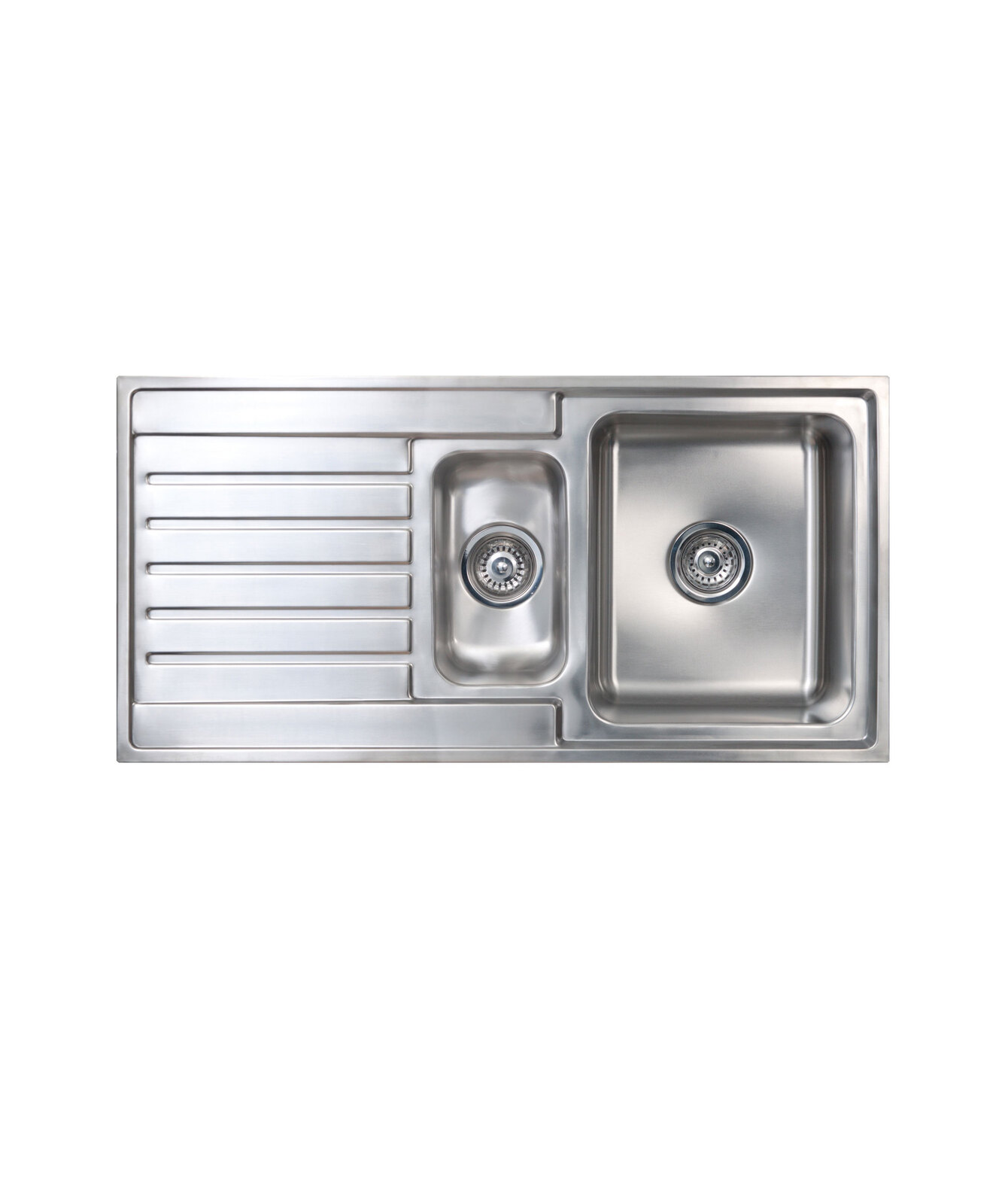 Square contemporary styling, modern drainboard design with bevelled edges Silk finish 0.8 mm thick premium 304 grade stainless steel Extra-deep bowls, large capacity Easy to clean rounded corners Sound deadening, designer basket waste Wide range of sink accessories available