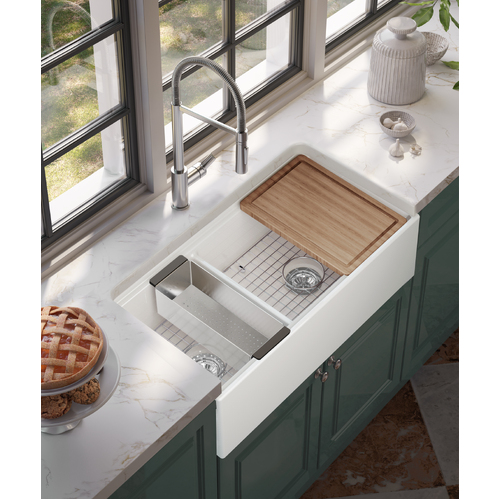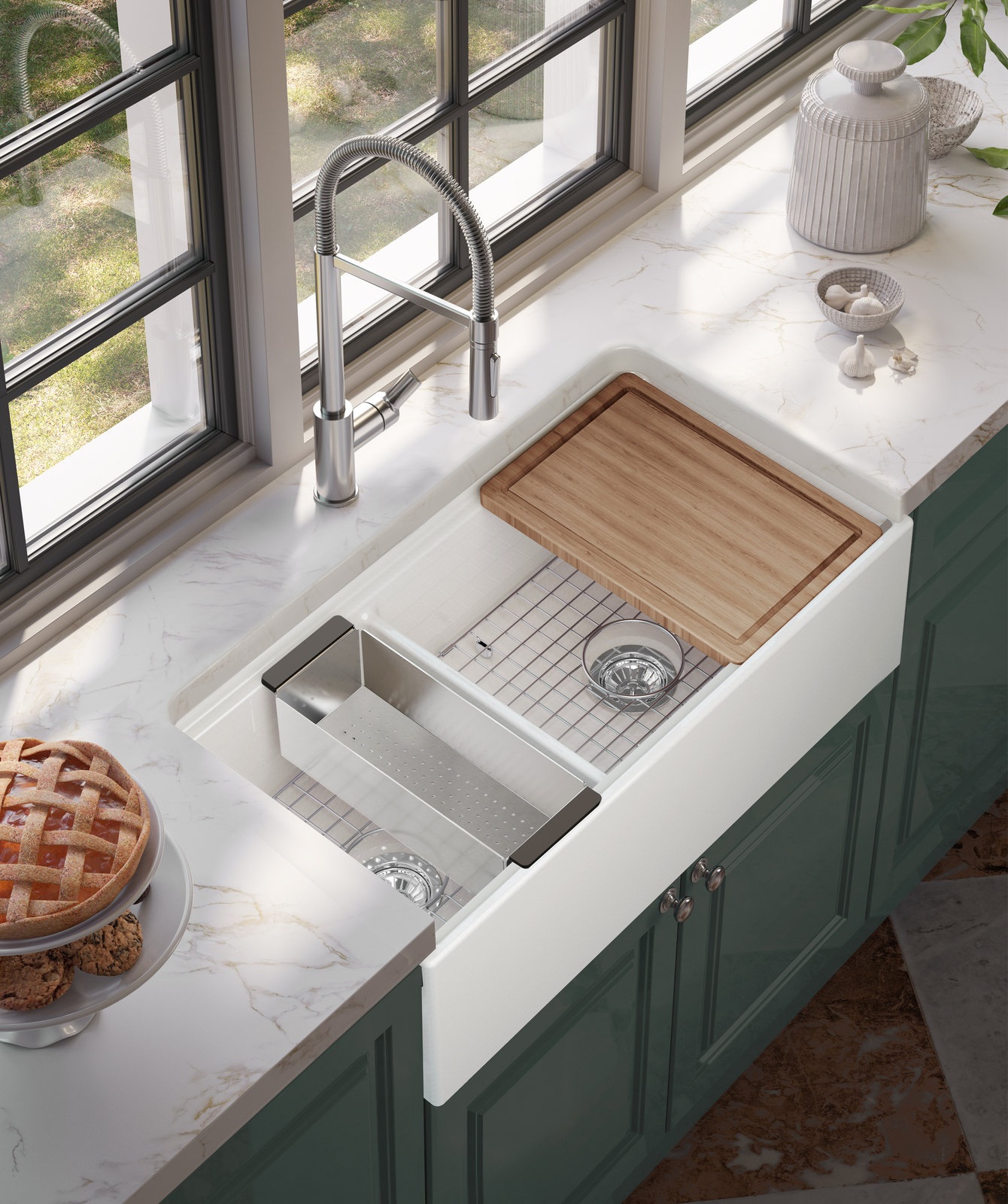 Odessa 920 is a Workstation sink with apron front (butler style) designed to facilitate the use of sink accessories such as the colander and cutting board.