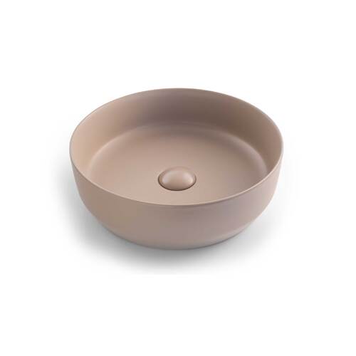 Dimensions: 385 diameter x 120H mm Type / mount: Above counter Material: Vitreous china Finish: Silk matte Colour: Smoky taupe Warranty: 20 years Overflow: No overflow Tapholes: No taphole