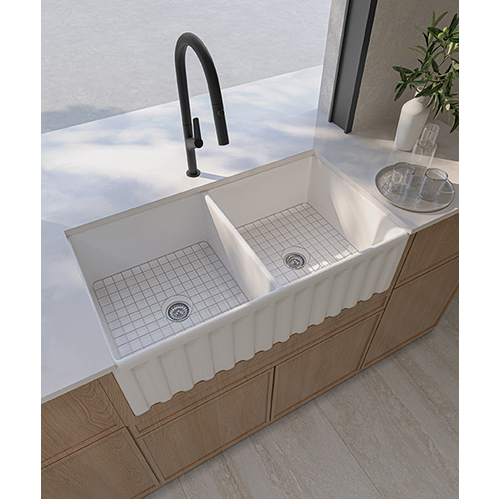 Cleo double-sided ceramic apron front sinks are designed to be installed with the front of the sink exposed. You can choose to expose the fluted side or the flat side, depending on your chosen style aesthetic.