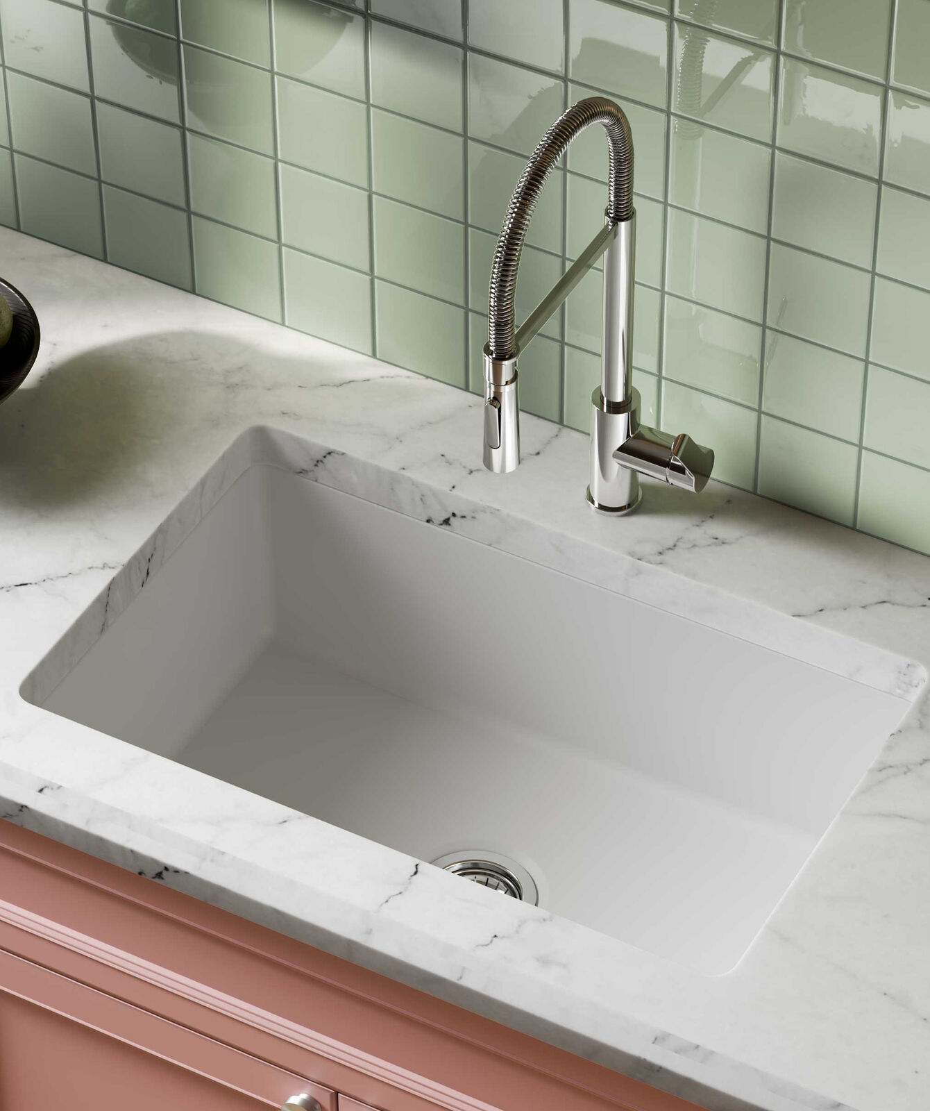 Odessa fireclay ceramic sinks are available in Dual Mount, Apron Front and Workstation styles, with single and double bowl options in various sizes.