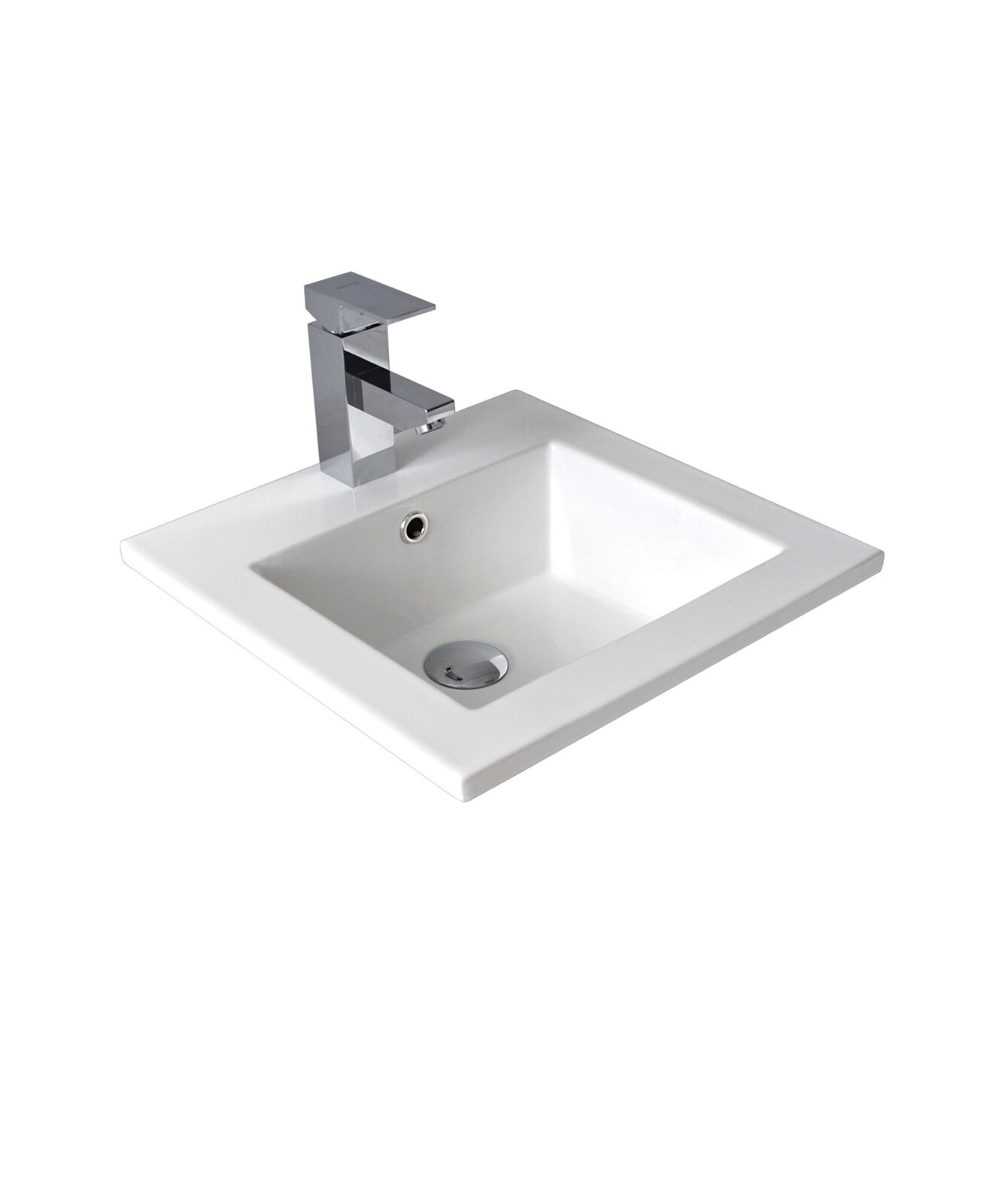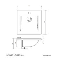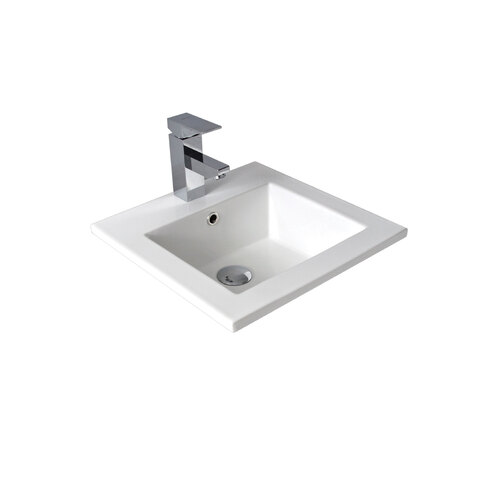 This contemporary basin has clean square lines and generous capacity. The rim sits above the benchtop with most of the basin underneath. The wide rim enables this inset basin to be used with a variety of benchtop materials.