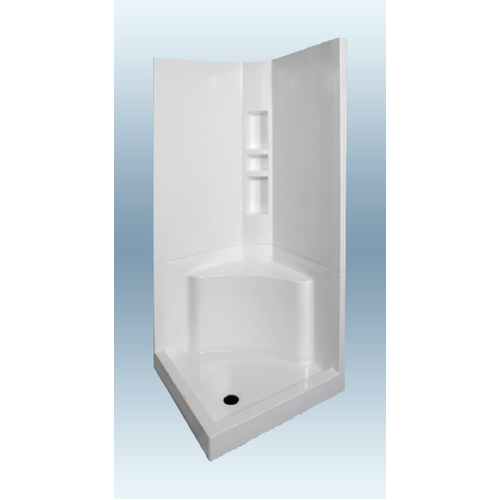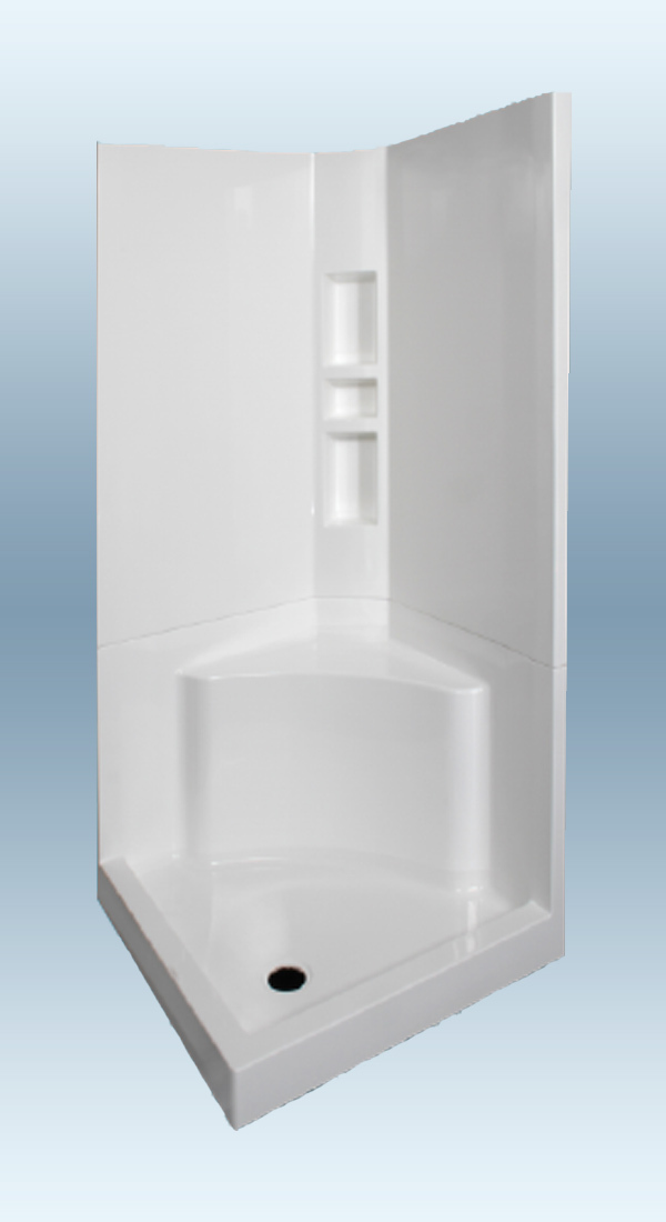 Compact Two piece corner enclosure for easy entry into bathrooms with smooth high gloss gel coated finish