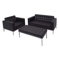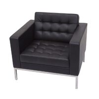 Elegant reception area arm chair with button finish to black PU, easy clean upholstery. Stainless steel underframe and legs. Backed by a 3 year warranty.
