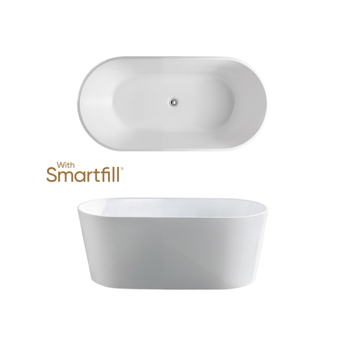 Seima Freestanding 1500 Bath with Smartfill Bath Filler Bezel and Waste in Brushed Nickel Sanitary Grade Acrylic Gloss White LIMNI 101 192560